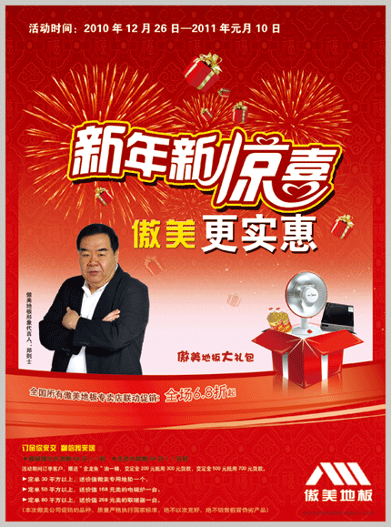 傲美地板在元旦期间,实行全国所有傲美地板专卖店联动促销,全场6.8折起,部分品种限量特价,价格年度最低特价。精品强化木地板68元/㎡起,生态木地板98元/㎡元起.